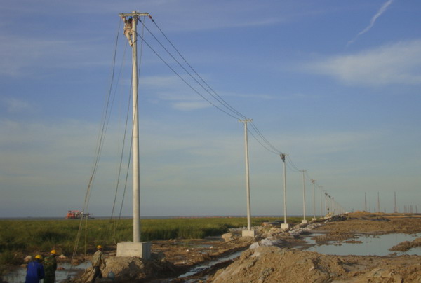 連云新城三期供電線路緊貼海堤邊。受海堤建設(shè)進(jìn)度和海風(fēng)海潮的影響,低矮的壩堤經(jīng)常被風(fēng)刮起的海浪浸頂,石塊突起,洼水漣漪,淤泥纏足,堤邊路面凹凸不平,道路僅限一輛車通行,擁擠不堪,工程施工難度極大。為提升速度,加快進(jìn)度,臺北供電所克服困難,緊鑼密鼓地展開工作,以期早日完工。現(xiàn)場勘察地形地貌,了解潮汐運動規(guī)律,制定施工計劃,設(shè)計措施方案,組織人力,采購材料,投入施工。施工人員采用彈性工作時間,利用落潮時機,搶運電桿,及時立桿和裝配。職工們發(fā)揚不怕苦,不畏難的精神,不懼海風(fēng)吹臉、海水浸衣,爬上距離海平面二十多米仿佛搖擺不定的高桿,懸在空中一絲不茍地操作,保障了工程的全面竣工。
