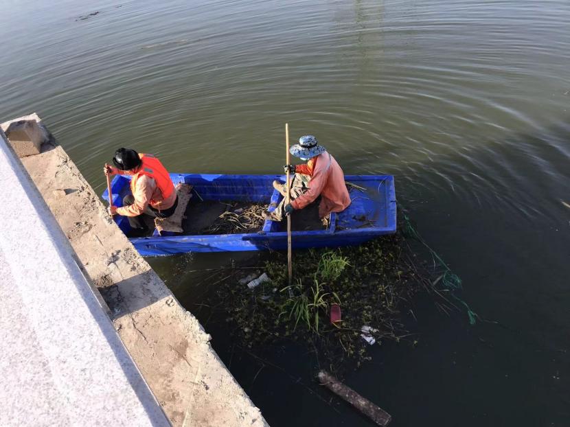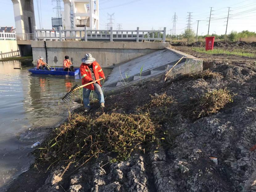 作業(yè)過程中,打撈人員因地制宜,采取分段清理、圍攔堵截、水上打撈等方式進(jìn)行打撈,有的坐在船上用濾網(wǎng)、鉤耙等工具清理河面雜草,有的在岸邊將水草打撈上岸,并其進(jìn)行集中處置,防止對河道造成二次污染。通過3個(gè)多小時(shí)的清理打撈,河道中的水流恢復(fù)暢通。